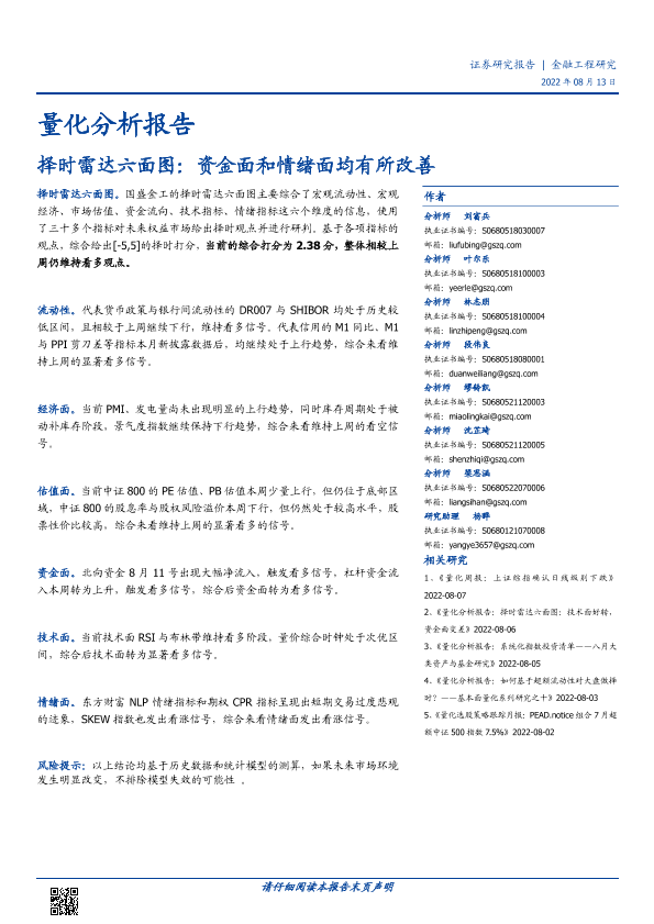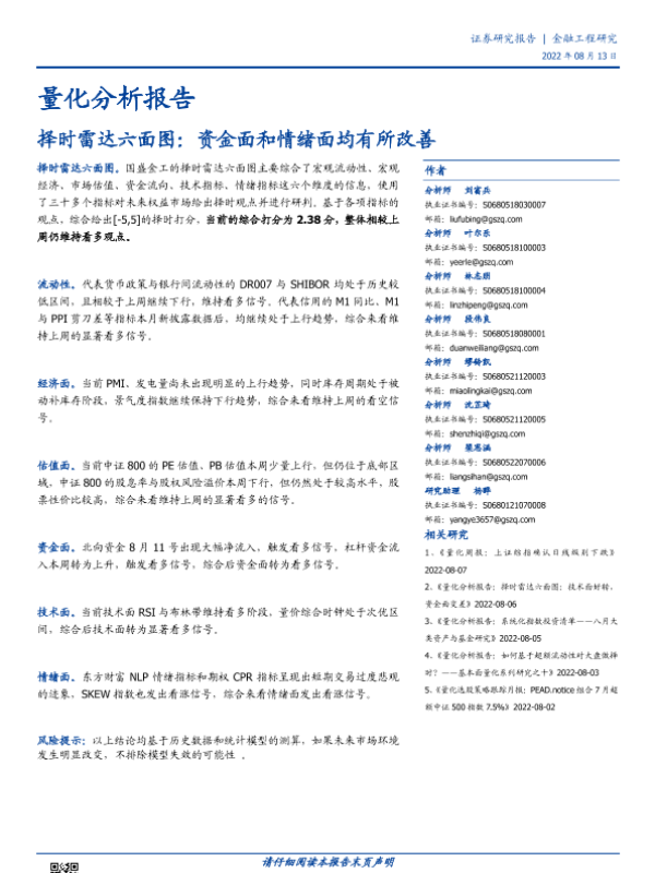 【国盛证券】【20220813】量化分析报告:择时雷达六面图,资金面和情绪面均有所改善-23页