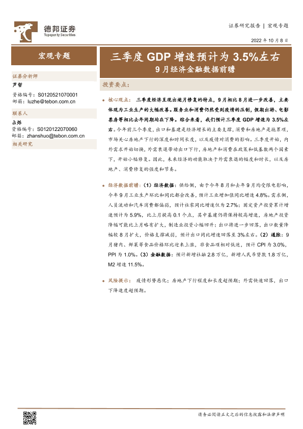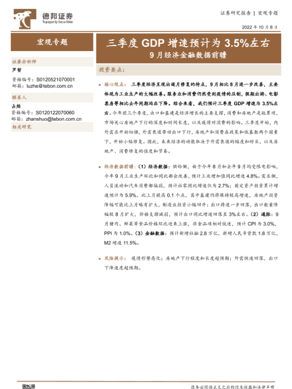 【德邦证券】【20221008】9月经济金融数据前瞻:三季度GDP增速预计为3.5%左右-12页