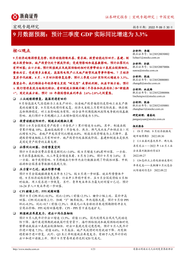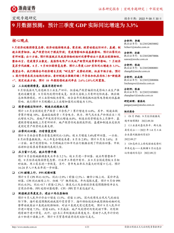 【浙商证券】【20220930】9月数据预测:预计三季度GDP实际同比增速为3.3%-23页