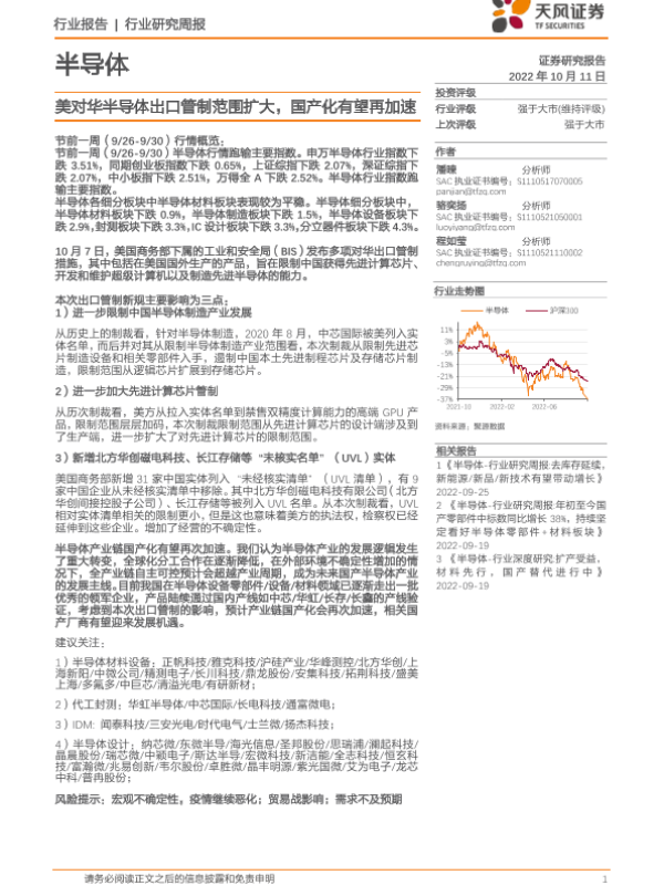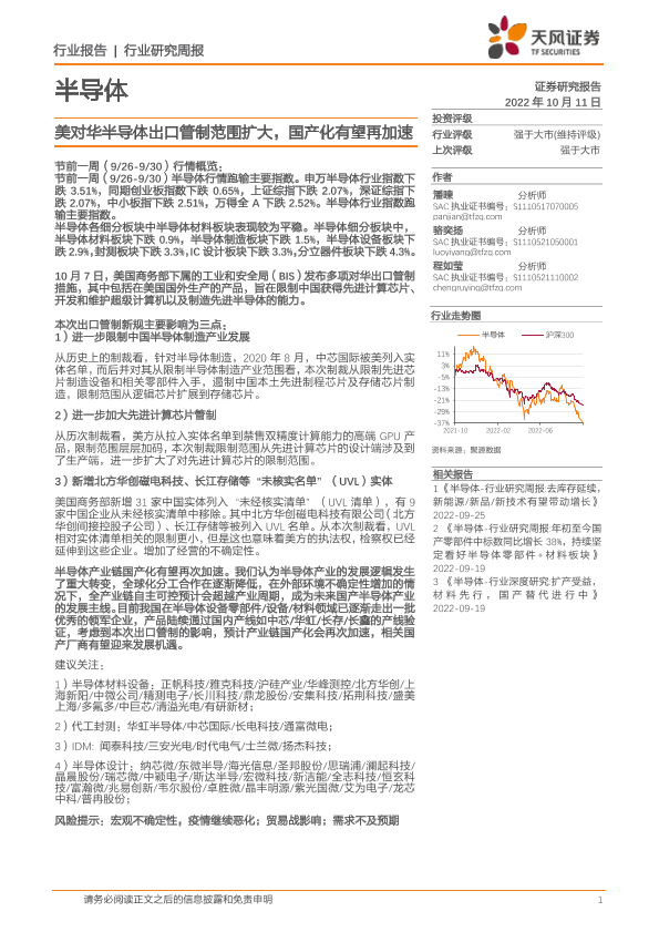 【天风证券】【20221011】半导体行业研究周报:美对华半导体出口管制范围扩大,国产化有望再加速-15页