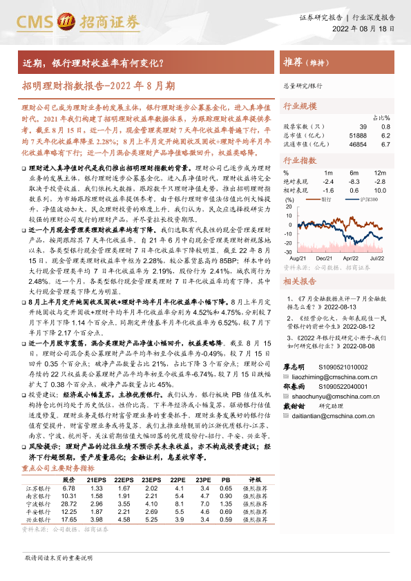 【海通证券】【20220818】银行业招明理财指数报告:2022年8月期,近期,银行理财收益率有何变化?-19页