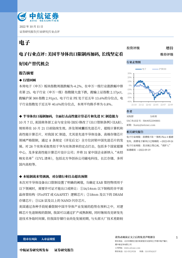 【中航证券】【20221011】电子行业点评:美国半导体出口限制再加码,长线坚定看好国产替代机会-15页