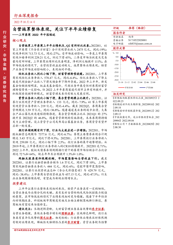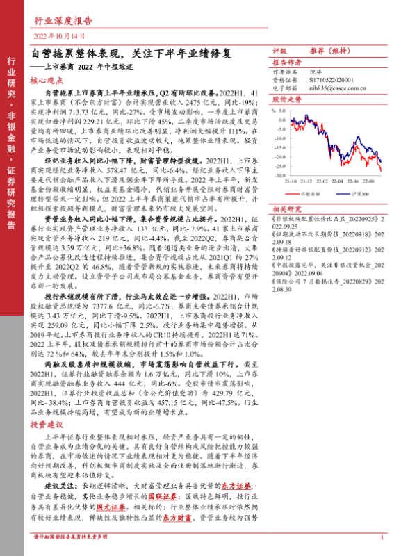 【东亚前海证券】【20221014】非银金融行业上市券商2022年中报综述:自营拖累整体表现,关注下半年业绩修复-22页