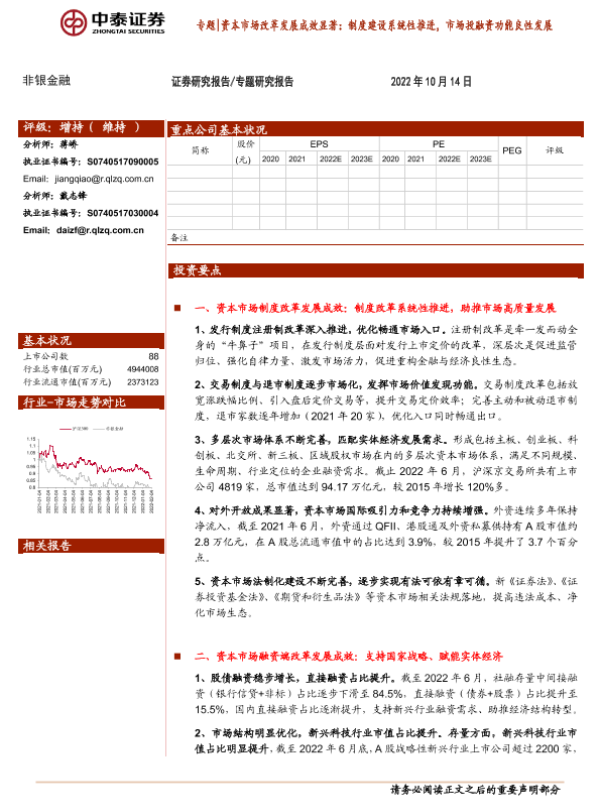 【中泰证券】【20221014】非银金融行业专题研究报告:资本市场改革发展成效显著,制度建设系统性推进,市场投融资功能良性发展-20页