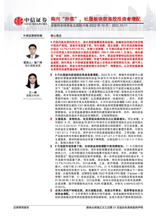 【中信证券】【20221011】港股和全球资金流跟踪月报_2022年10月:南向“抄底”,社服板块获港股投资者增配-22页