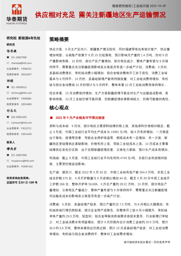 【华泰期货】【20221009】工业硅月报:供应相对充足,需关注新疆地区生产运输情况-22页