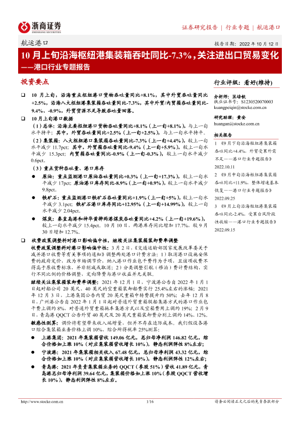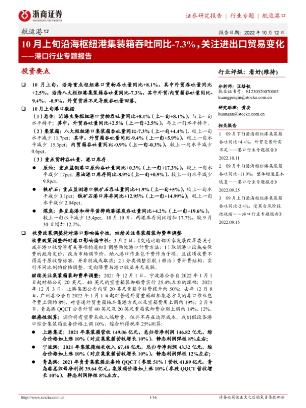 【浙商证券】【20221013】港口行业专题报告:10月上旬沿海枢纽港集装箱吞吐同比-7.3%,关注进出口贸易变化-16页
