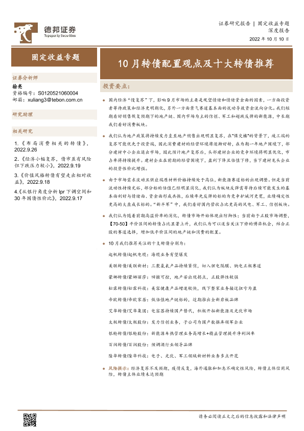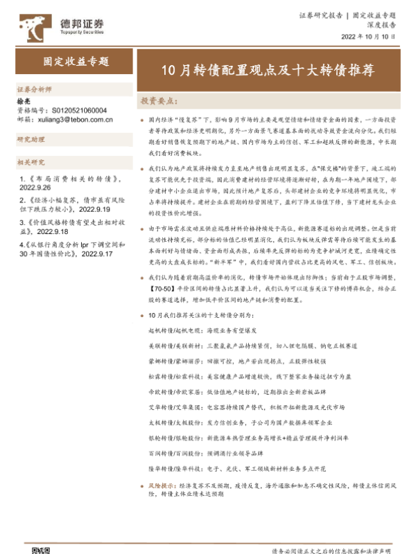 【德邦证券】【20221010】固定收益专题:10月转债配置观点及十大转债推荐-24页