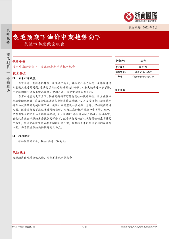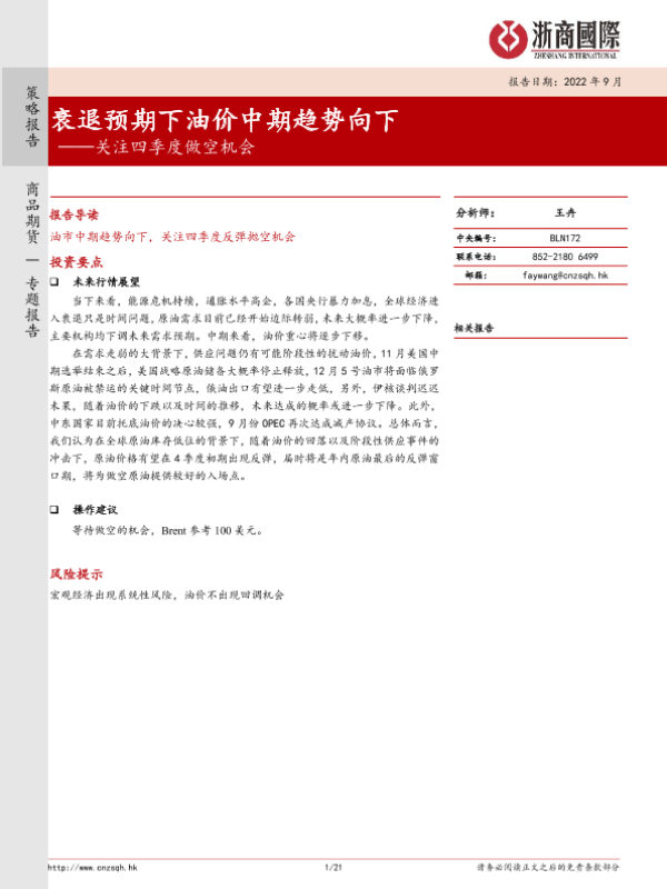【浙商国际】【202209】关注四季度做空机会:衰退预期下油价中期趋势向下-21页