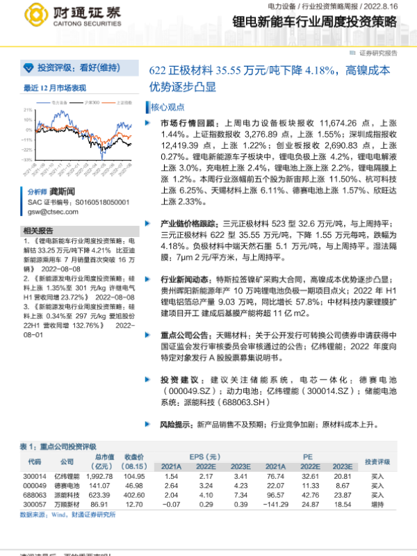 【财通证券】【20220816】锂电新能车行业周度投资策略:622正极材料35.55万元吨下降4.18%,高镍成本优势逐步凸显-19页