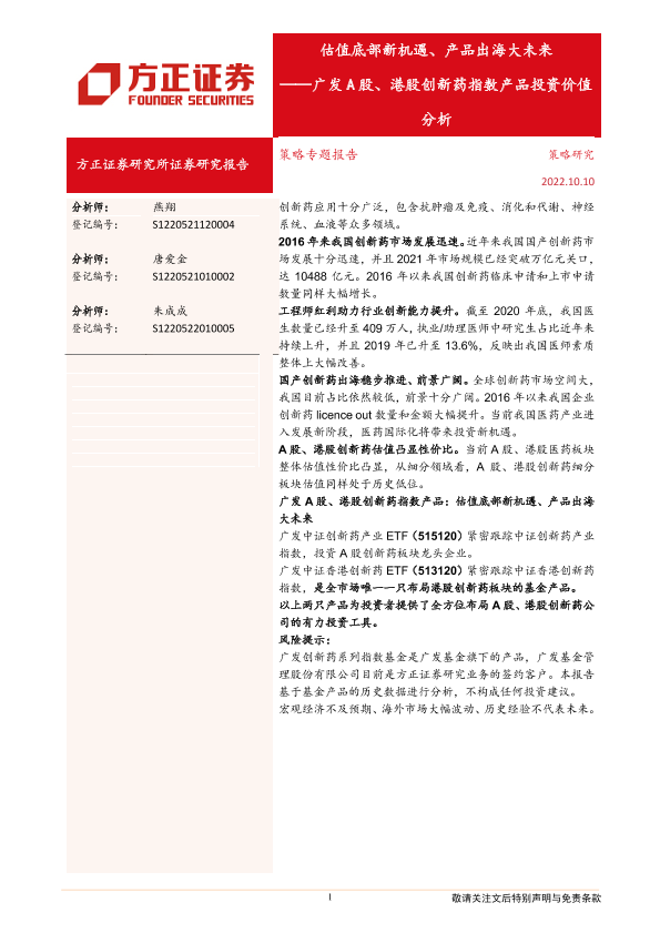 【方正证券】【20221010】广发A股、港股创新药指数产品投资价值分析:估值底部新机遇、产品出海大未来-19页