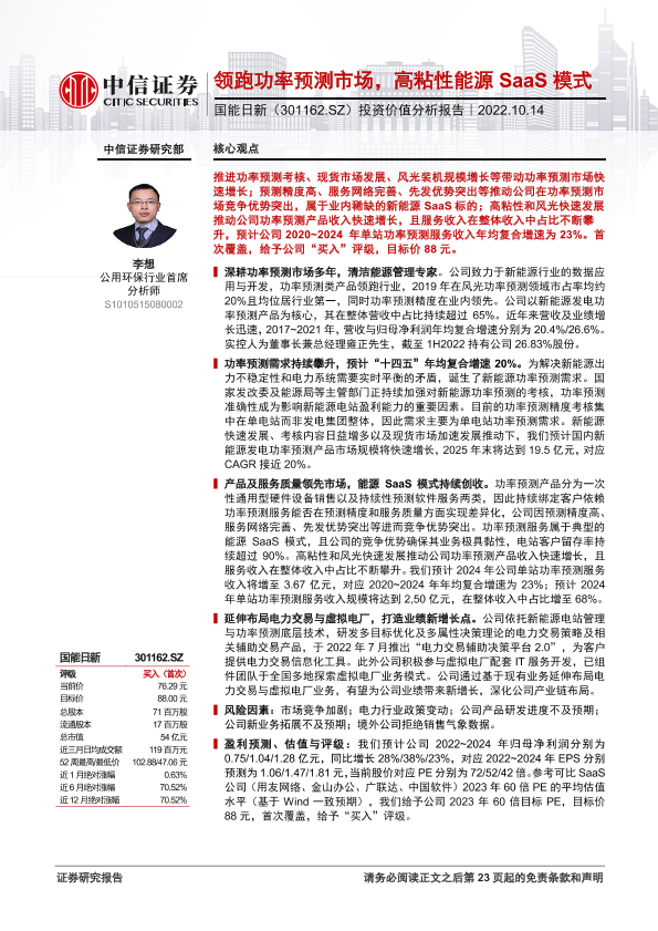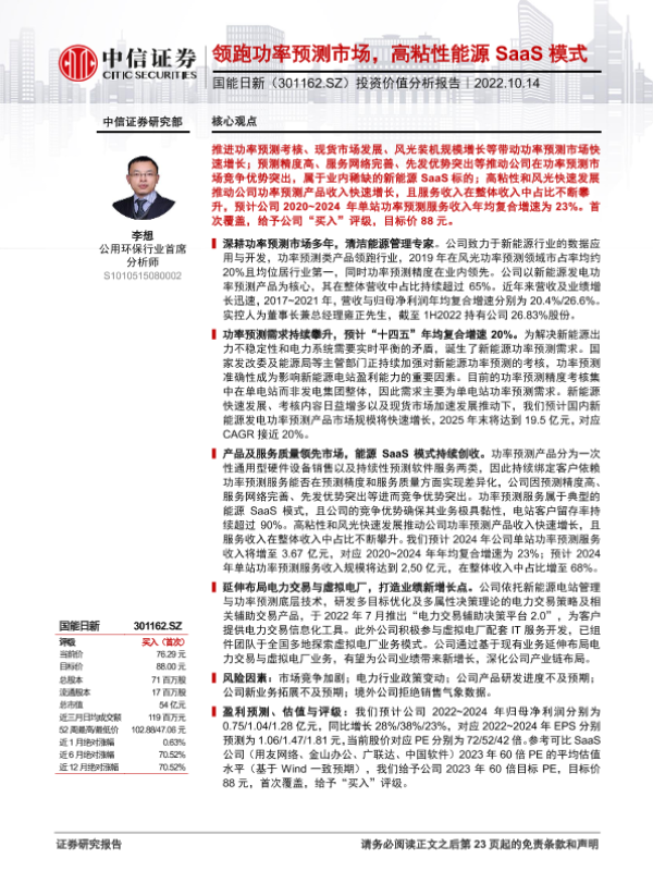 【中信证券】【20221014】国能日新-301162-投资价值分析报告:领跑功率预测市场,高粘性能源SaaS模式-24页