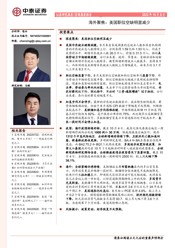 【中泰证券】【20221008】海外聚焦:美国职位空缺明显减少-13页