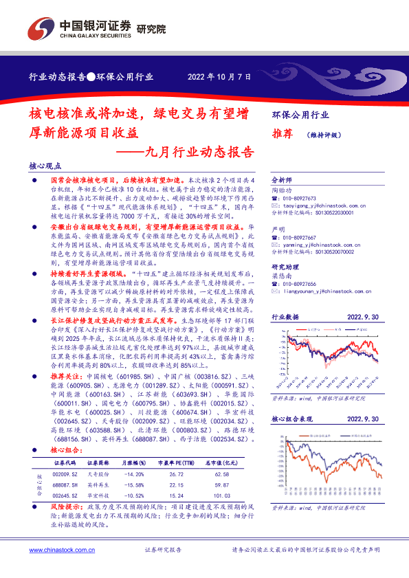 【银河证券】【20221007】环保公用行业九月行业动态报告:核电核准或将加速,绿电交易有望增厚新能源项目收益-24页