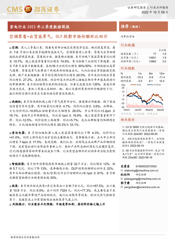 【海通证券】【20221009】家电行业2022年三季度数据简报:空调零售+出货高景气,DLP投影市场份额环比回升-15页