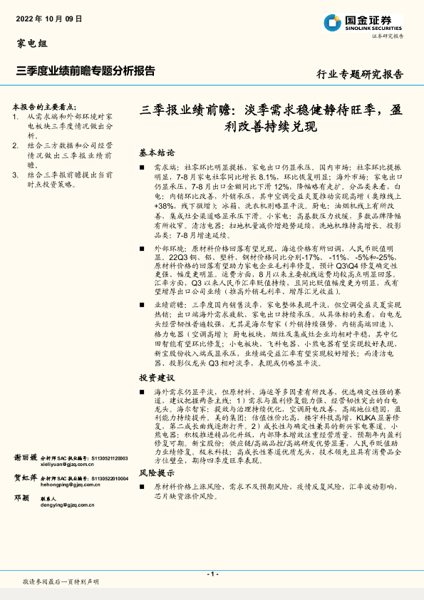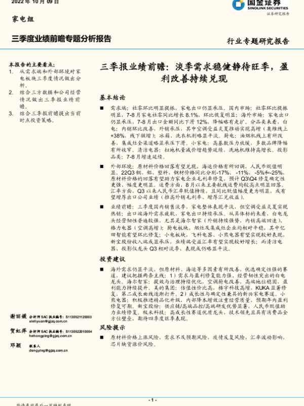 【国金证券】【20221009】家电行业三季报业绩前瞻:淡季需求稳健静待旺季,盈利改善持续兑现-15页