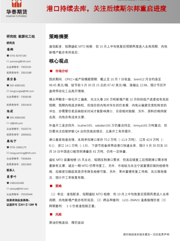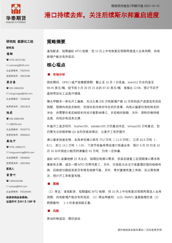 【华泰期货】【20221010】甲醇月报:港口持续去库,关注后续斯尔邦重启进度-20页