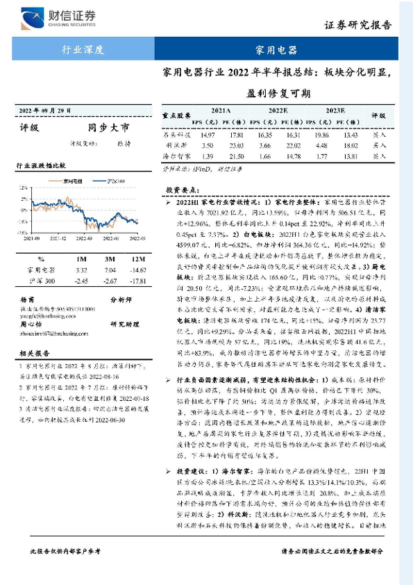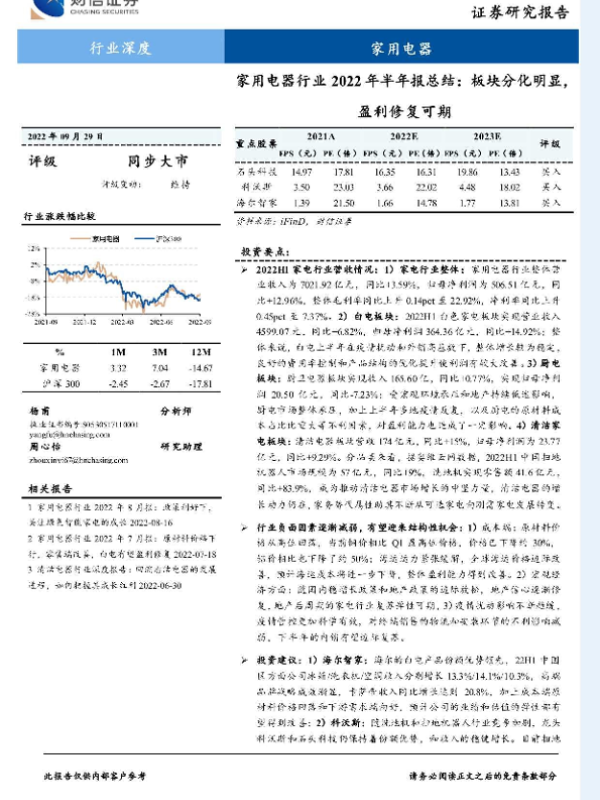【财信证券】【20220929】家用电器行业2022年半年报总结:板块分化明显,盈利修复可期-22页