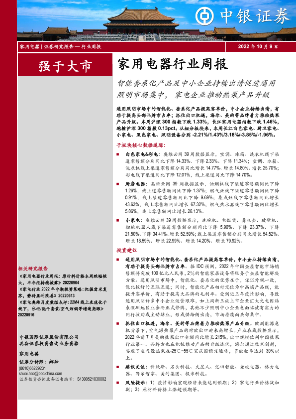 【中银证券】【20221009】家用电器行业周报:智能套系化产品及中小企业持续出清促进通用照明市场集中,家电企业推动热泵产品升级-28页