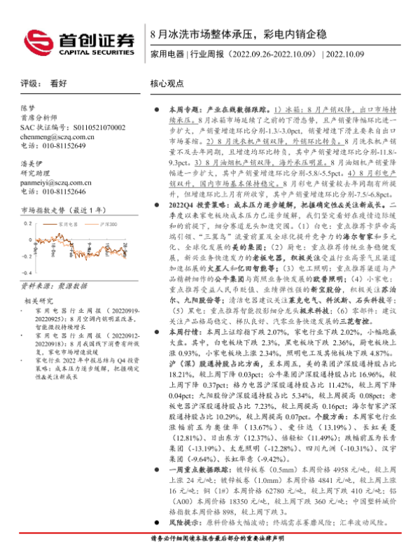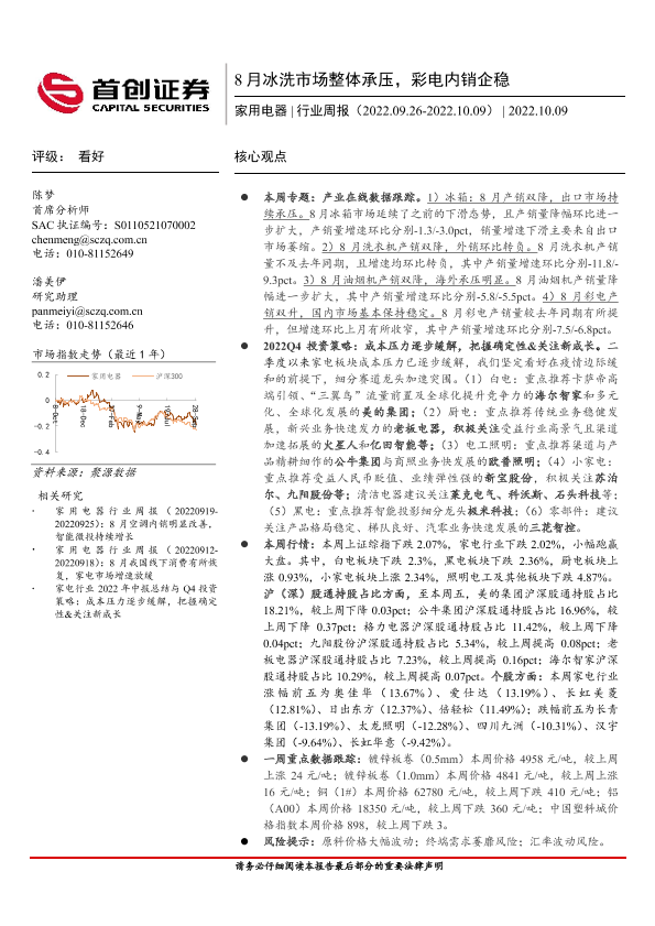 【首创证券】【20221009】家用电器行业周报:8月冰洗市场整体承压,彩电内销企稳-19页