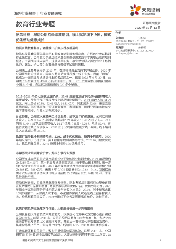 【天风证券】【20221013】教育行业专题:粉笔科技,深耕公职招录职教培训,线上赋能线下协同,模式优化带动健康成长-20页