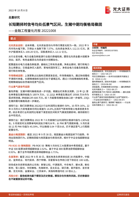 【光大证券】【20221008】金融工程量化月报:长短期择时信号均处低景气区间,生猪中期均衡格局稳固-20页