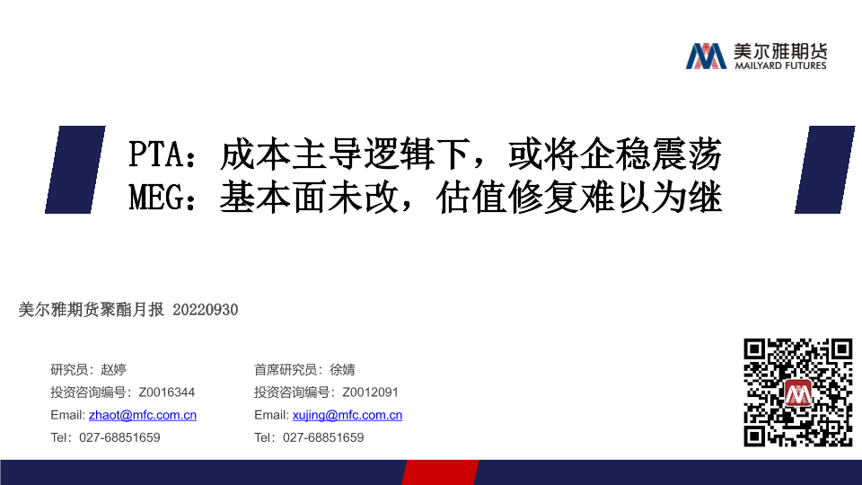 【美尔雅期货】【20220930】聚酯月报:PTA,成本主导逻辑下,或将企稳震荡,MEG,基本面未改,估值修复难以为继-23页