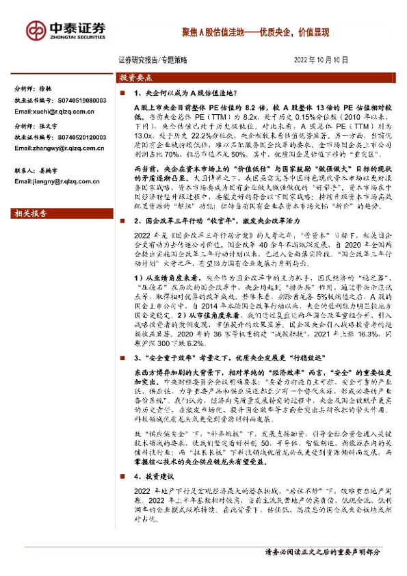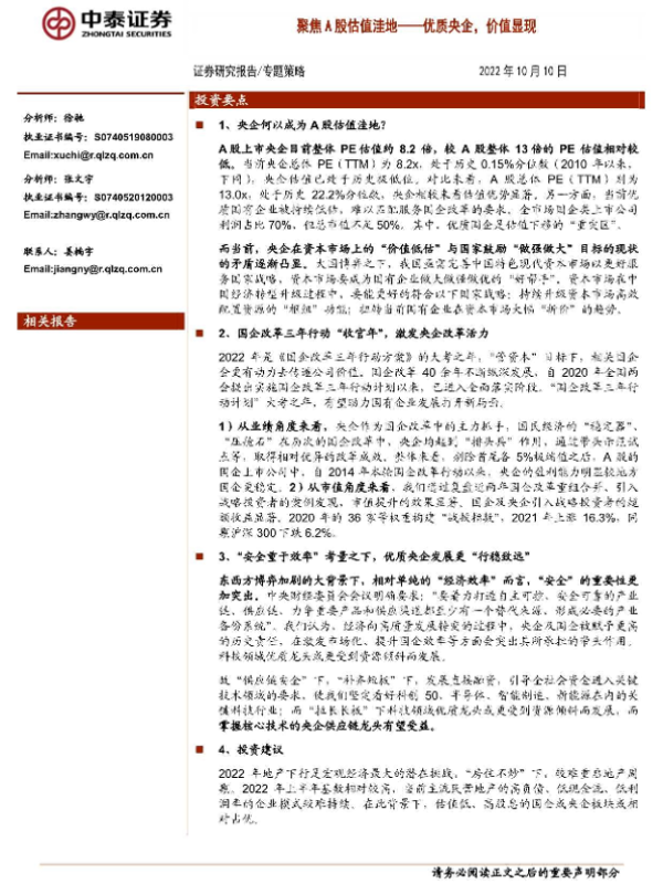 【中泰证券】【20221010】聚焦A股估值洼地:优质央企,价值显现-16页