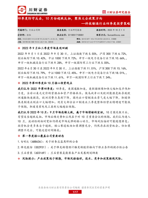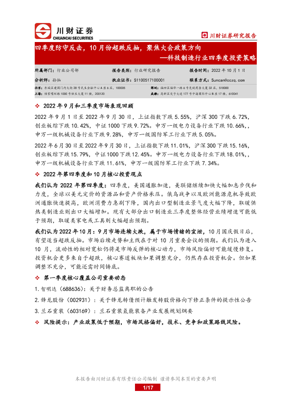 【川财证券】【20221001】科技制造行业四季度投资策略:四季度防守反击,10月份超跌反抽,聚焦大会政策方向-17页