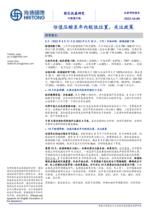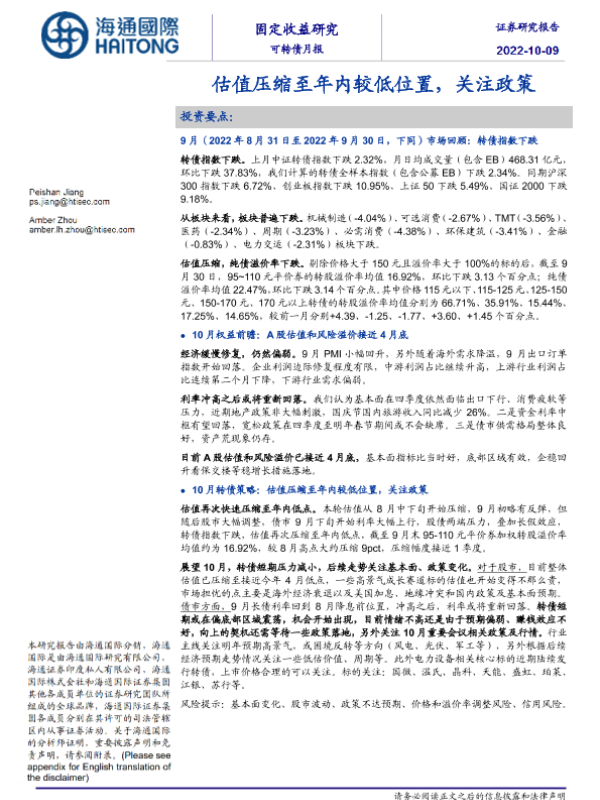 【海通国际】【20221009】可转债月报:估值压缩至年内较低位置,关注政策-17页