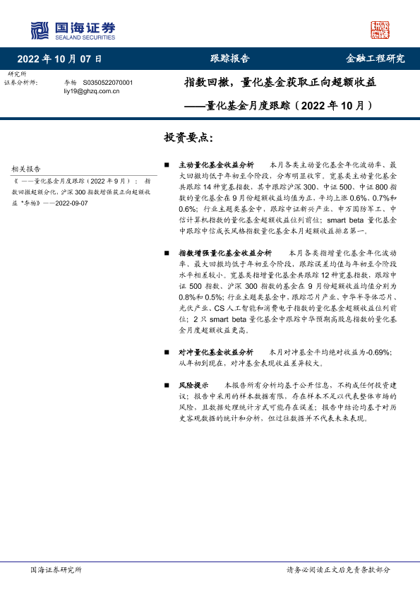 【国海证券】【20221007】量化基金月度跟踪(2022年10月):指数回撤,量化基金获取正向超额收益-17页
