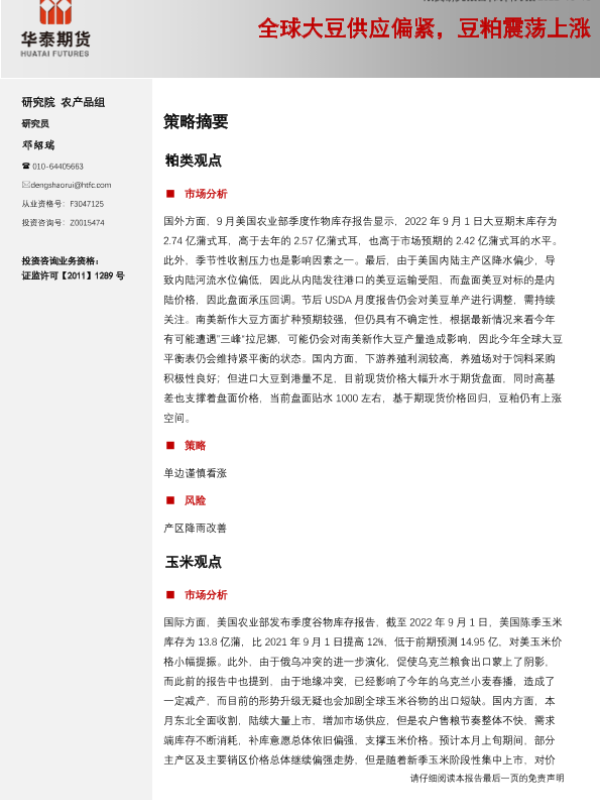 【华泰期货】【20221010】饲料月报:全球大豆供应偏紧,豆粕震荡上涨-19页