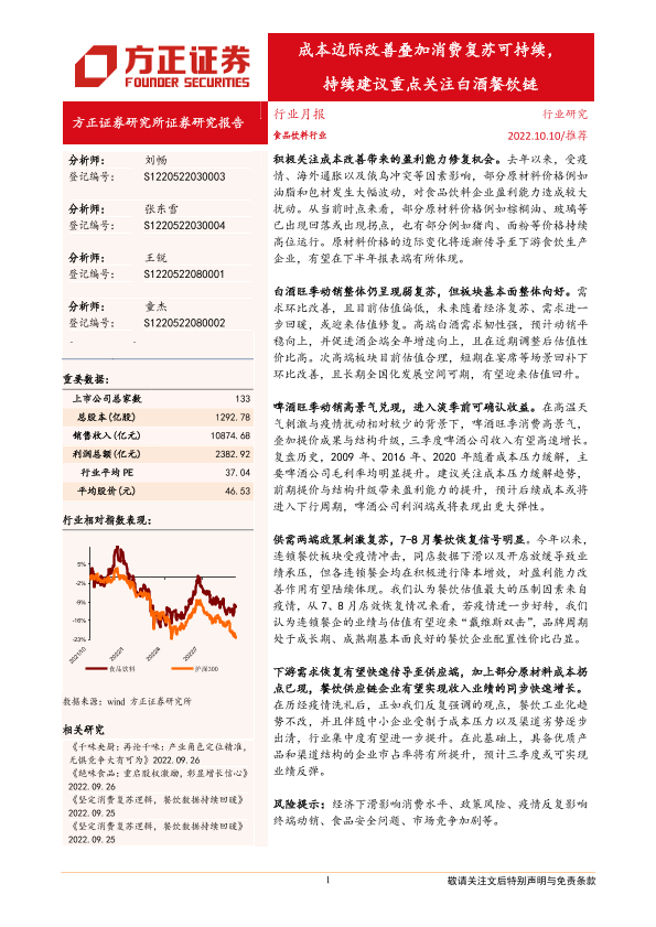 【方正证券】【20221010】食品饮料行业:成本边际改善叠加消费复苏可持续,持续建议重点关注白酒餐饮链-21页
