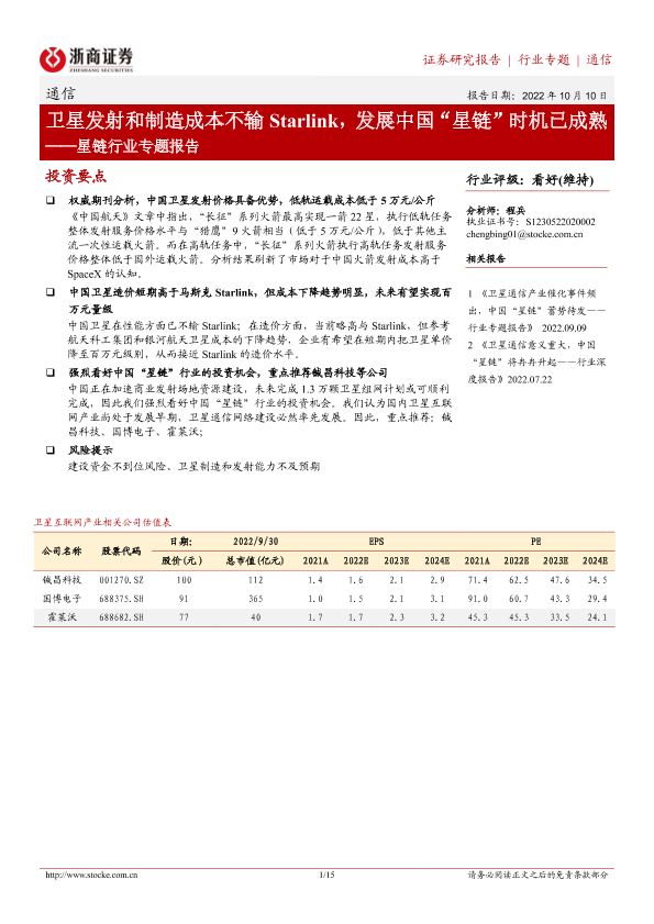 【浙商证券】【20221010】通信:星链行业专题报告-卫星发射和制造成本不输Starlink,发展中国“星链”时机已成熟-15页