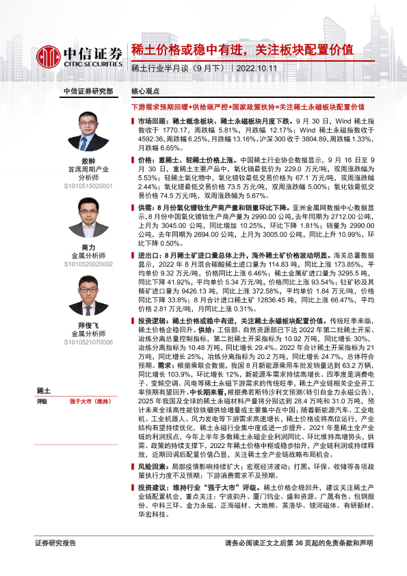 【中信证券】【20221011】稀土行业半月谈(9月下):稀土价格或稳中有进,关注板块配置价值-37页
