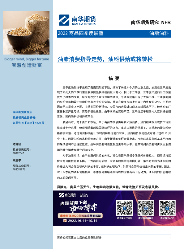 【南华期货】【20220930】油脂油料2022商品四季度展望:油脂消费指导走势,油料供给或将转松-21页