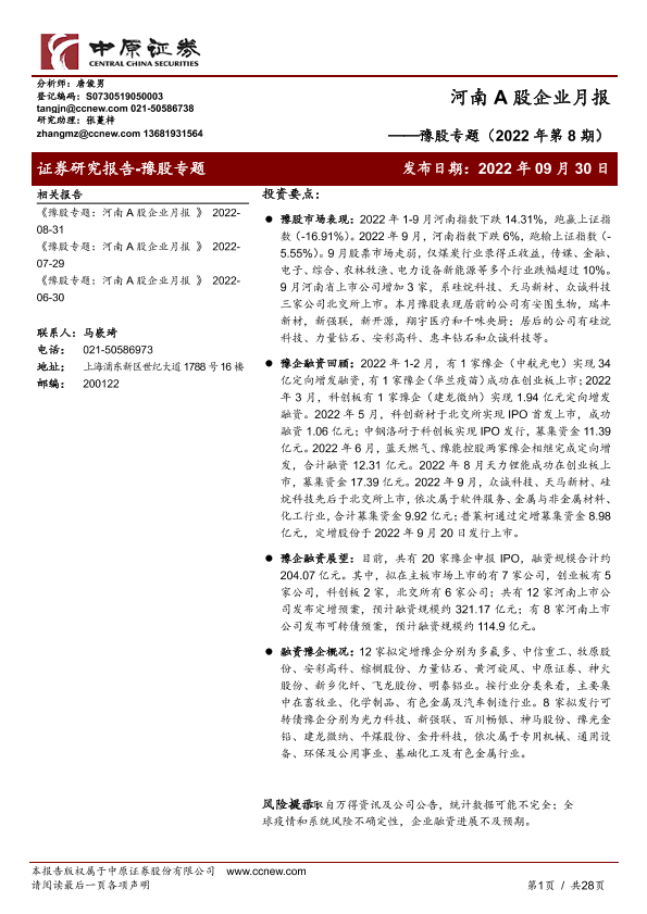 【中原证券】【20220930】豫股专题(2022年第8期):河南A股企业月报-28页