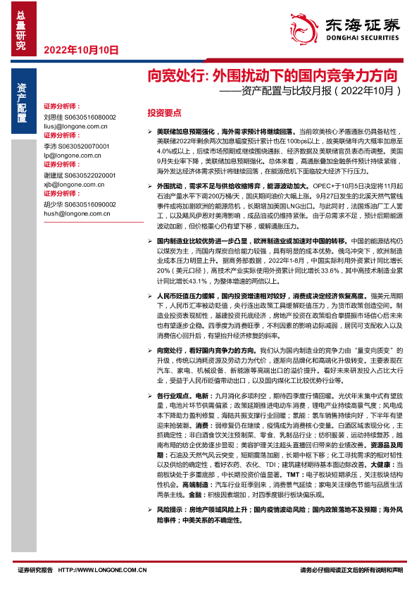 【东海证券】【20221010】向宽处行 外围扰动下的国内竞争力方向——资产配置与比较月报(2022年10月)-45页