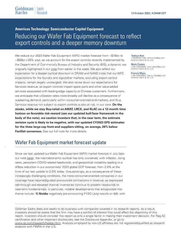 【Goldman Sachs】【20221013】Reducing our Wafer Fab Equipment forecast to reflect export controls and a deeper memory downturn-19页