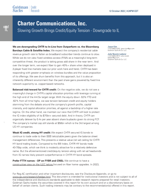 光纤部署 宽带订阅放缓 信用股权紧张 资本配置优先级 CHTR评级下调