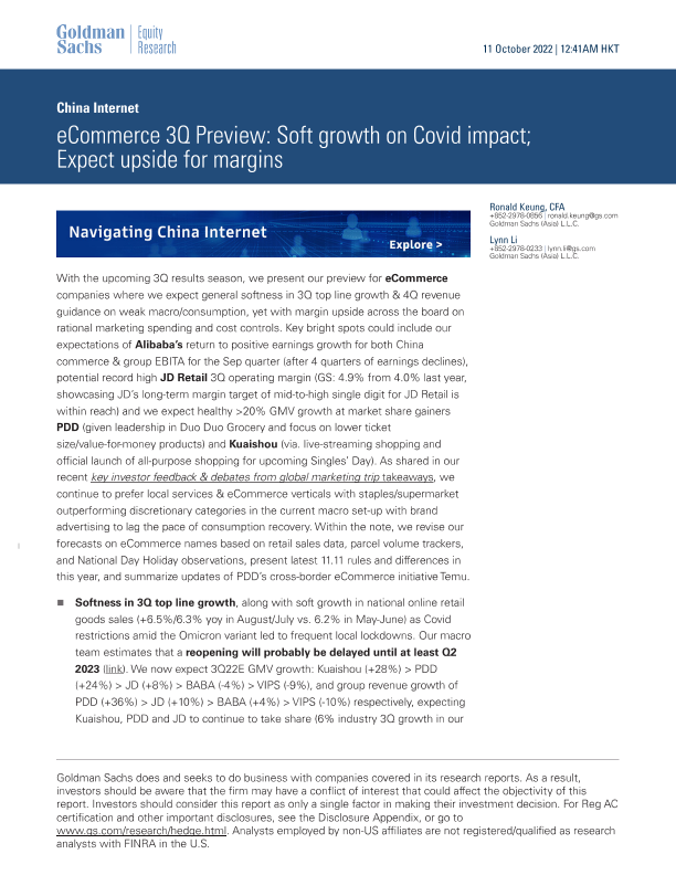 【Goldman Sachs】【20221011】eCommerce 3Q Preview Soft growth on Covid impact; Expect upside for margins-36页