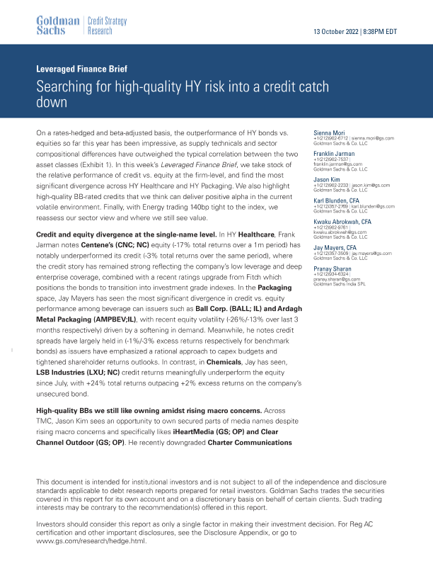 【Goldman Sachs】【20221013】Searching for high-quality HY risk into a credit catch down-18页