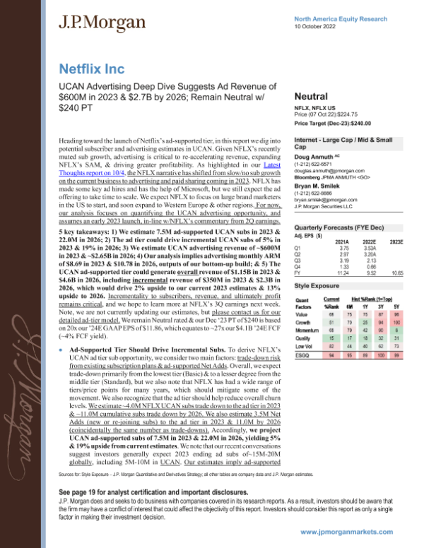 【J.P. Morgan】【202210】Netflix Inc-UCAN Advertising Deep Dive Suggests Ad Revenue of $600M in 2023&$2.7B by 2026-23页