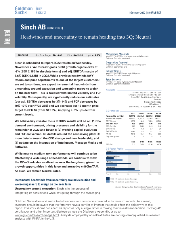 【Goldman Sachs】【20221011】(SINCH.ST)_ Headwinds and uncertainty to remain heading into 3Q; Neutral-10页