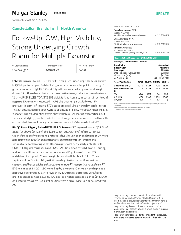 【Morgan Stanley】【20221006】Constellation Brands Inc Follow-Up OW; High Visibility, Strong Underlying Growth, Room for Multiple Expansion-13页