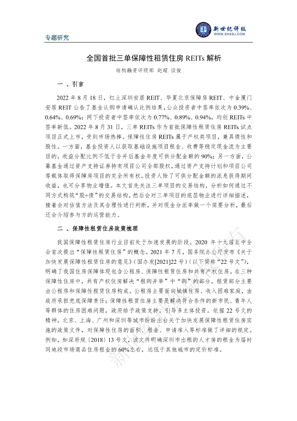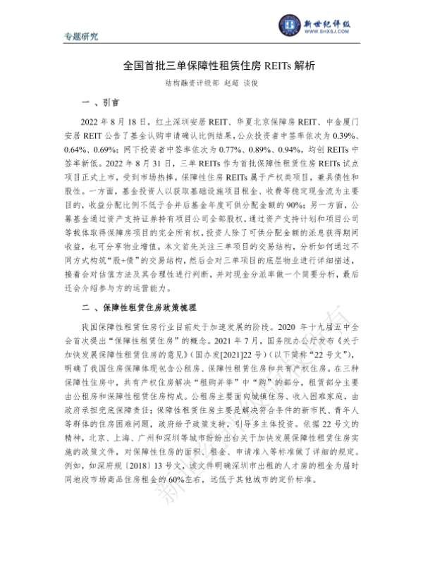 【新世纪评级】【2022】全国首批三单保障性租赁住房REITs解析-15页