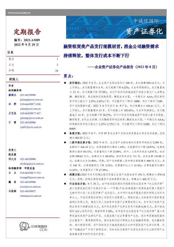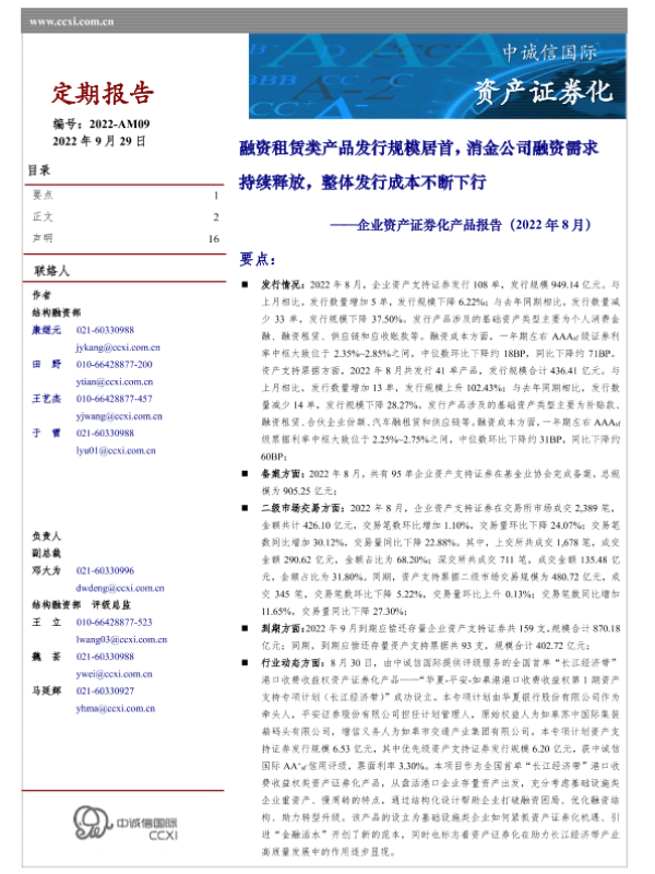 【中诚信国际】【202208】中诚信-企业资产证券化产品报告(2022年8月)-16页