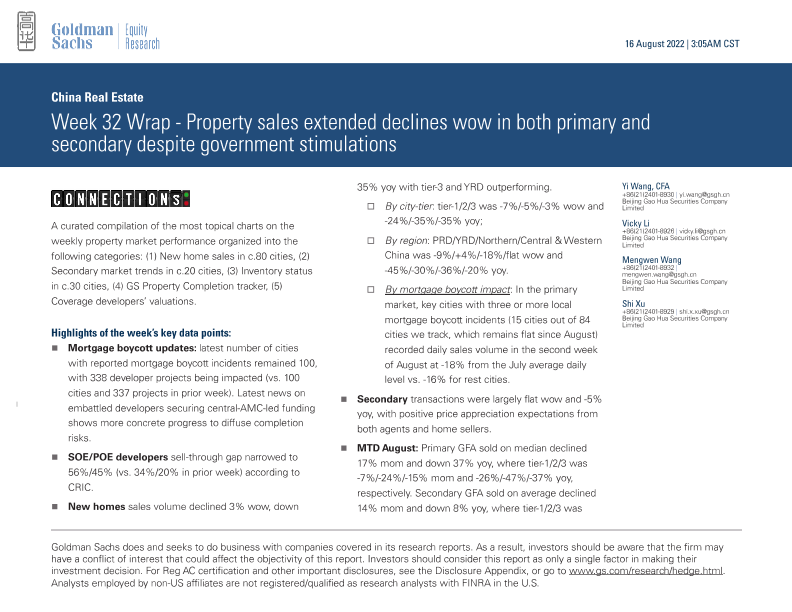 【Goldman Sachs】【20220816】中国房地产周报第32周:尽管有政府刺激,一、二手房销售均持续下降-16页