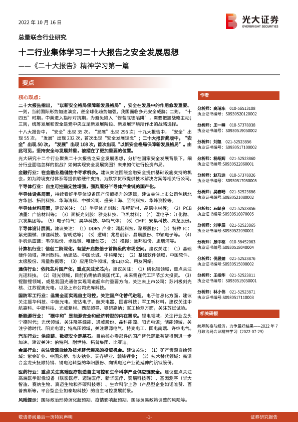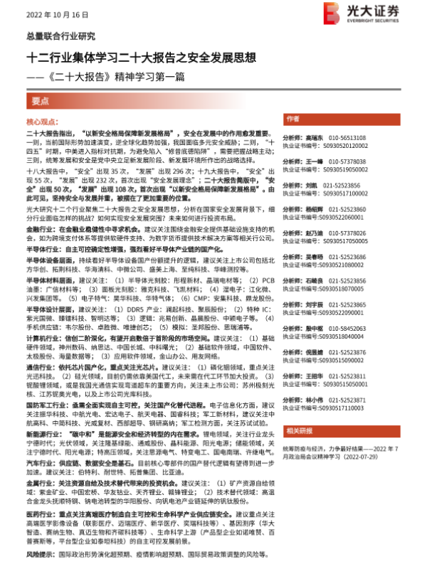 二十大报告 安全发展 投资建议 行业分析 金融证券