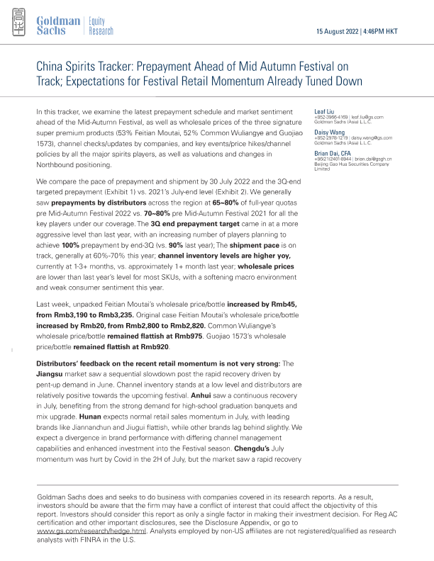 【Goldman Sachs】【20220815】China Spirits Tracker Prepayment Ahead of Mid Autumn Festival on Track; Expectations for Festival Retail Momentum Already Tuned Down-18页